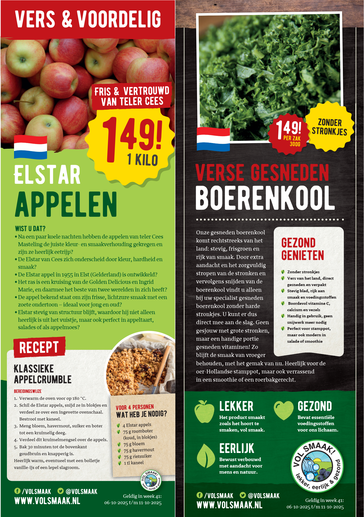 Gezond; groenten en fruit bevatten veel essentiële voedingsstoffen voor ons lichaam dat het noodzakelijk is om hier bewust mee om te gaan. Natuurlijk zal uw detaillist de ‘Vol Smaak’ producten aanbieden tegen een aantrekkelijke prijs. Daarnaast vindt u op de folder interessante informatie over de producten en een lekker recept!